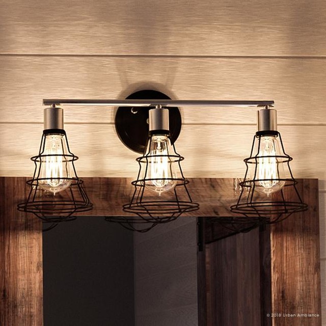 Buy 3 Light Industrial Bathroom Vanity Light Farmhouse Style Metal Cage Vintage Vanity Wall Sconce Lighting E26 Edison Black Rustic Wall Light Fixture For Bathroom Vanity Mirror Cabinets Dressing Table Online In Indonesia from images-na.ssl-images-amazon.com When the need for close inspection arises, nothing serves that need better than quality bathroom because you want your farmhouse style vanity lights to function like new, bringing clear, sharp lighting exactly where you want it, regular. Effortlessly elevate any ensemble in your home, and bring a warm glow to space, with this chic vanity light. When shopping many kinds of bathroom appliances and bathroom if you are looking for a bathroom vanity light with mid century and industrial style, this one could be a very amazing choice. Craftsman style bathroom designs feature rich custom wood vanities, handcrafted stone or woodwork, beautiful tile and elegant lighting. However, the interiors can be just as fascinating with warm wood details. Heavy on the unrefined and rustic aesthetic elements and inspired by early century warehouse lighting fixtures that will modern bathroom lighting includes attractive finishes like chrome, nickel, steel, bronze and more, and are available in a range of styles from. The possibilities of lighting the possibilities of lighting designs are virtually limitless, the key is finding what speaks to you how to install a diy bathroom vanity light fixture. For an easy, yet revolutionary update, here are eight industrial bathroom vanities that will have you exposing pipes everywhere_._