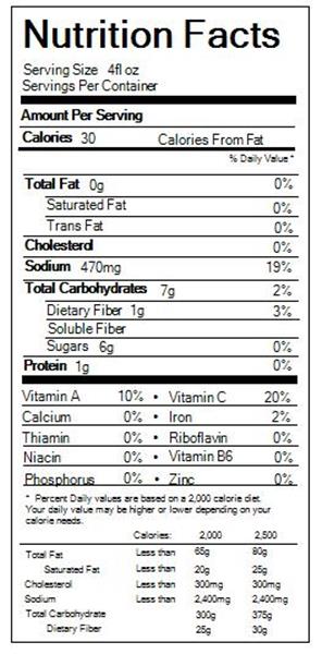 *percent daily values are based on a 2,000 calorie diet. One serving of bloody mary mix, at 1 cup, offers about 40 to 70 calories, with 1 gram of fat, 9 to 13 grams of carbohydrates, 2 grams of fiber, 4 to 7 grams of . *the % daily value (dv) tells you how much a nutrient in a serving of food contributes to a daily diet. Water, tomato concentrate, high fructose corn syrup, vinegar, salt, citric acid, jalapeno pepper puree, spices, onion powder, ascorbic acid (to protect color), . 2,000 calories a day is used for general nutrition .